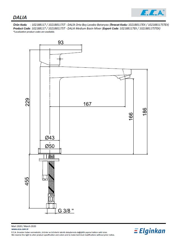 Modern tesislerimizde ürettiğimiz Eca Dalia orta boy lavabo bataryası tesisatınıza bağlamadan önce bu kılavuzun tamamını dikkatle okumanızı rica ederiz. Banyo, küvet, duş ve aplike armatürler fayans üstünden; Lavabo Bataryaları lavabo seramiği üstünden; Bide Bataryaları bide seramiği üstünden, Eviye Bataryaları mutfaklarda tezgah veya eviye üstünden tesisata bağlanabilen sıhhî tesisat bataryalarıdır. İlgili standartlara göre bataryaların su giriş sıcaklığı maksimum 90°C’dır. Tavsiye edilen maksimum çalışma sıcaklığı 65°C’dır. Armatürün zarar görmemesi için sürekli olarak kesinlikle 65°C’ın üzerinde kullanılmamalıdır. İlgili standartlara göre batarya girişlerindeki maksimum su basıncı 10 bar’dır. Tavsiye edilen maksimum çalışma basıncı 5 bar’dır. Bataryanızın zarar görmemesi için sürekli olarak kesinlikle 5 bar’ın üzerinde kullanılmamalıdır. Boyutsal olarak TS EN 817 standardının 6.5 özel durumlar maddesine uygun imal edilen ürünlerimiz bulunmaktadır.
