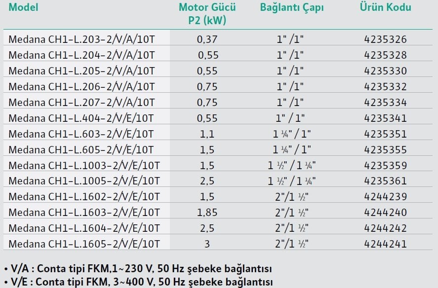 - Tüm modellerde gövde, çark ve kademe bölmelerinin opsiyonel olarak AISI 316 L yapılabilme avantajı